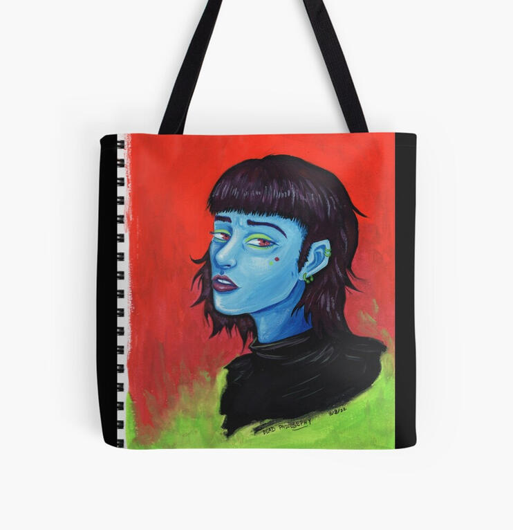 Clothing, bags, pins, journals, pet accessories, drinkware, homegoods, and more are available on Redbubble and TeePublic.