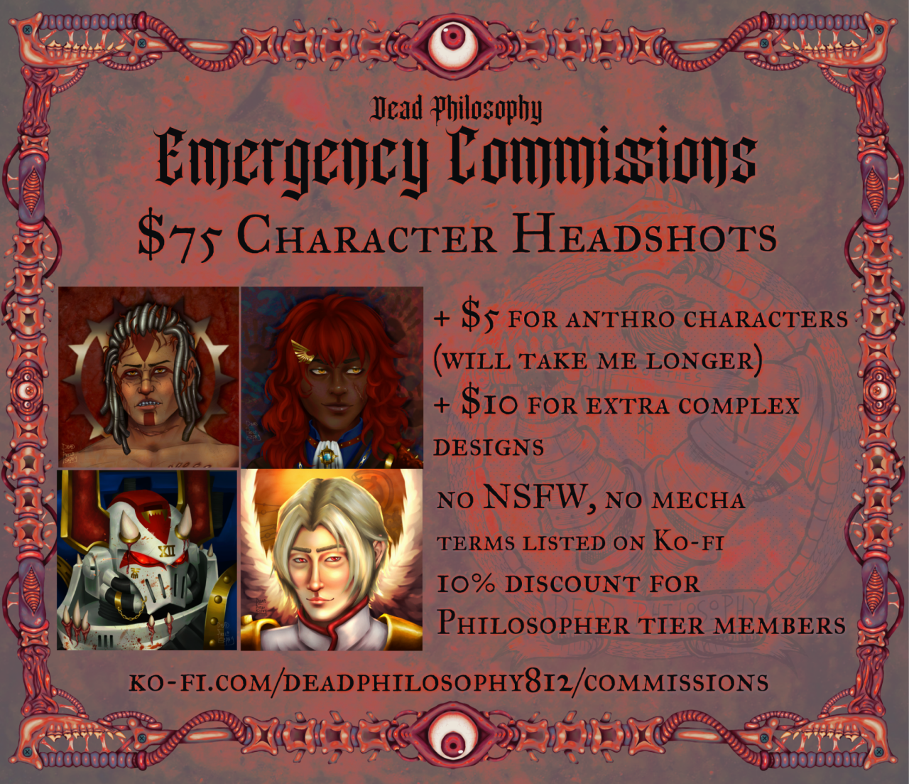 Need a portrait of your OC or a favorite character? I can make it happen, starting at 75 USD for a base portrait.