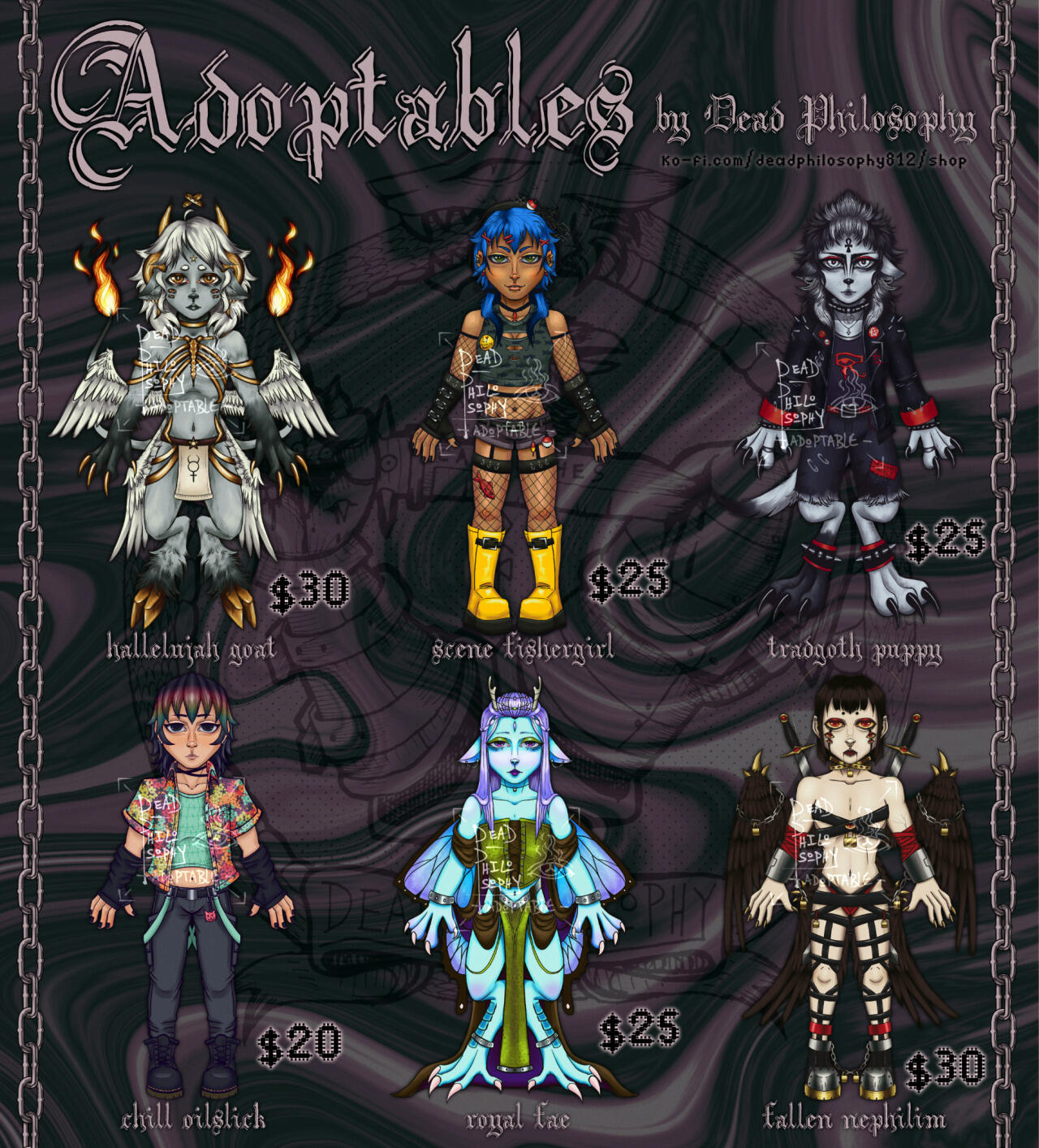 Adoptables and coloring pages are available on my Ko-fi shop.